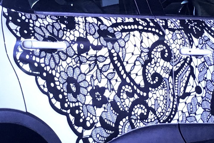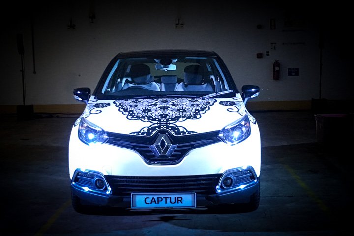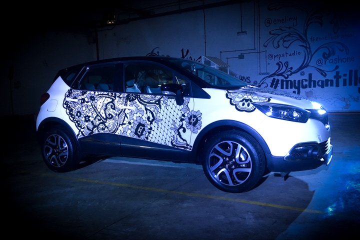 The Captur has an Ivory body, Diamond Black roof and lace print livery inspired by the Chantilly lace which features in the Emel Raya 2018 Collection.