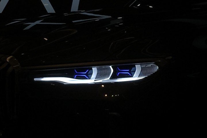 Most noticeable is the prominently large front grille, the largest dimensions ever for any vehicle from BMW. Other eye-catching features are the slim, elongated twin headlights with the signature blue Xs of BMW laser lights, the prominent chrome bar across the front apron and the large chrome air breathers along the sides.