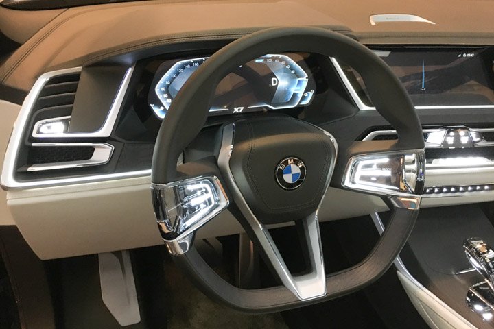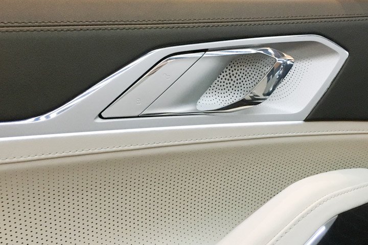 There are no door handles. Instead there are pressure sensors that release the doors when touched. The interior is an ode to luxury craftsmanship, convenience and comfort: upholstered in fine leather with open-pore wood and aluminium details. In this instance,Smoke White leather seats with dark Olive-Bronze leather on the seat bolsters. The X7 will be equipped with the latest technology available through the touchscreen infotainment units and integrated through BMW Connected.
