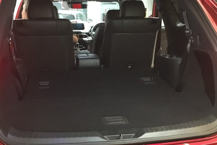 The seating configurations for the petrol CX-8 are 2+3+2 fabric seats for the base model with bench seating in the second row; 2+2+2 fabric seats in the mid-spec petrol, with space between the individual seats in the second row to walk-through to the third rows or, in the top-spec petrol and top-of-the-range diesel, leather seats in a 2+2+2 configuration with a fixed centre console between the individual second row seats. The third row seats in all four variants can be folded down flat to increase boot capacity.