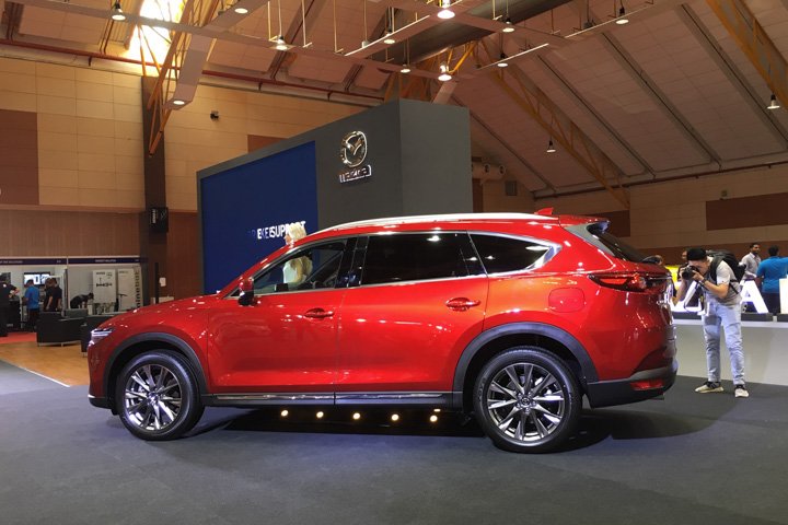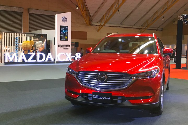 Mazda has the CX-8 SUV on preview. The long wheelbase version of the CX-5 is available in petrol and diesel variants with several seating configurations. The car on display is the diesel which has leather seats in a 2+2+2 configuration with a fixed centre console between the individual second row seats.