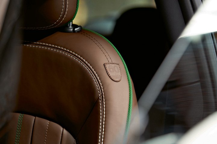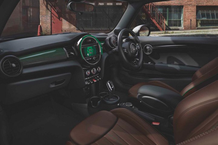 There’s a sense of occasion too; the ’60 Years’ logo projects from the exterior wing mirrors, while the themed door sill welcomes the driver inside. The interior upholstery brings the retro feel into the modern era; the hand-stitched MINI Walknappa Leather steering is a contrast to the Dark Maroon seats with bold white and green stitches with green piping. The ’60 Years’ logo is also placed on the shoulders of the front seats and at the bottom of the steering wheel.