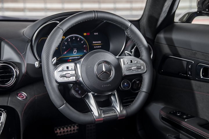 For the two AMG GT models, these two get the new AMG steering wheel buttons from the GT-4 door and C 63. These consist of a round controller with an integrated display beneath the right-hand steering-wheel spoke, plus two vertically positioned colour display buttons with switches beneath the left-hand steering-wheel spoke.