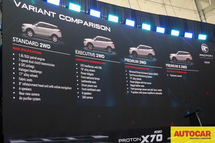 Proton has launched the locally-assembled X70 SUV which now starts from RM94,800, down RM5000 from the Proton X70 launched in December 2018 from China. There are now four trim levels: the Standard 2WD, Executive 2WD, Premium 2WD and Premium X 2WD. The Premium and Premium X have almost identical specs except the Premium X comes with a panoramic sunroof. A four-wheel drive variant is no longer offered. Prices are as follows:
