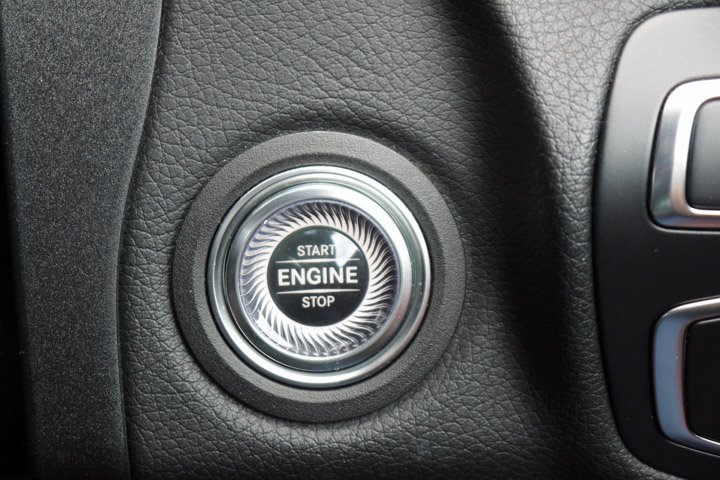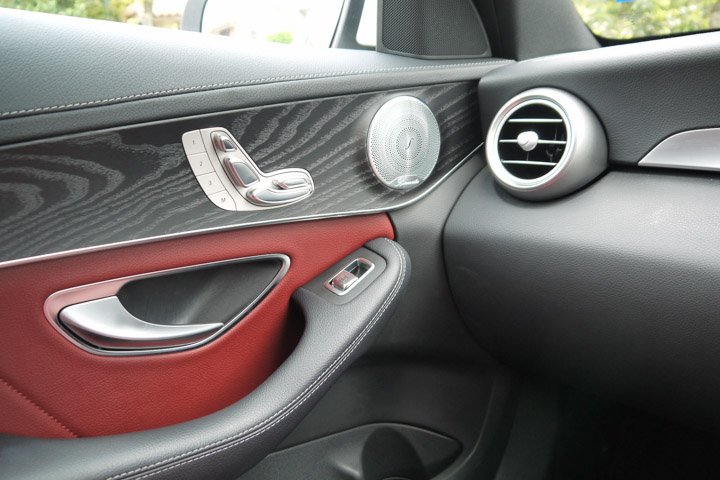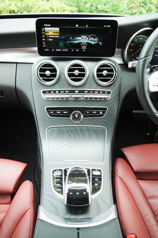 Keyless entry has been added to the C300. The cabin design was elegant in 2014 but but now look dated in comparison. The swathes of shiny-shiny black have now been restricted to a few switches and small surfaces, the new glass-topped ignition button, satin aluminium and matt black open pore wood fascia has rejuvenated the interior and also upped the air of expensiveness. Our test car had racy red leather on the seats and doors but black and tan leather are more muted alternatives.