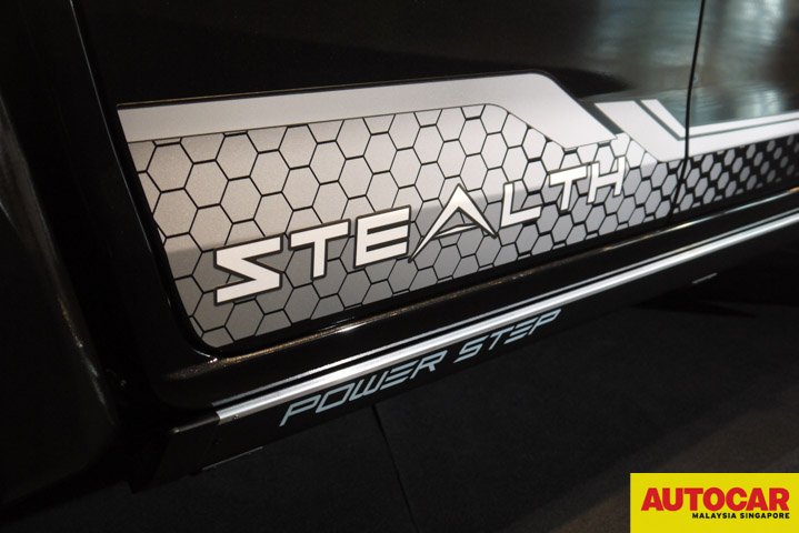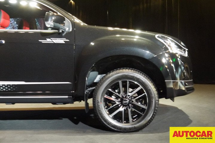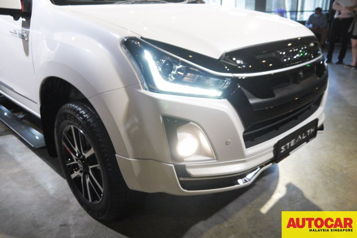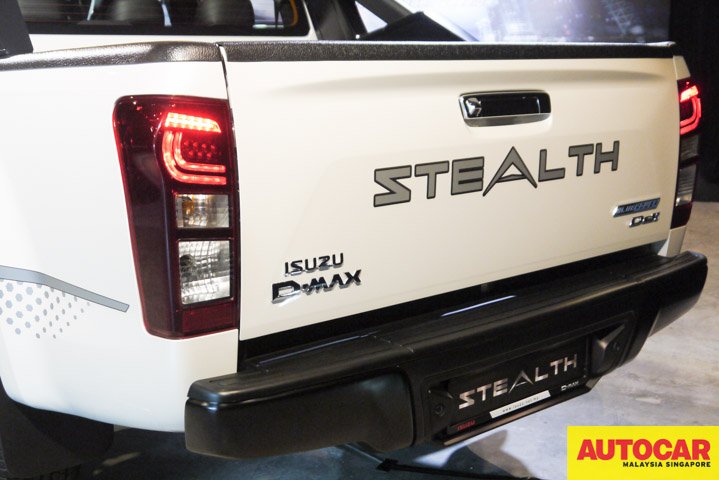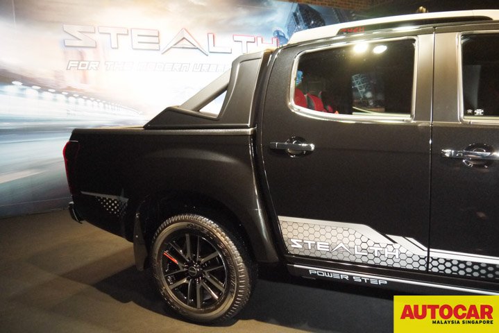 The Stealth has the new 1.9-litre Ddi Blue Power engine launched last year. The Stealth is based on the Isuzu D-Max 4×4 Premium Automatic model with blacked components and additional accessories. The blacked components are the front grille, headlamp, fog lamp, bumper garnish, roof rails and rear bumpers. There are “Stealth” logos on the truck: luminous decals on the body, on the rims, on the leather backs of the seats. The 18-inch alloy wheels are two-tone and have a single red trim and “Stealth” on one of the spokes.