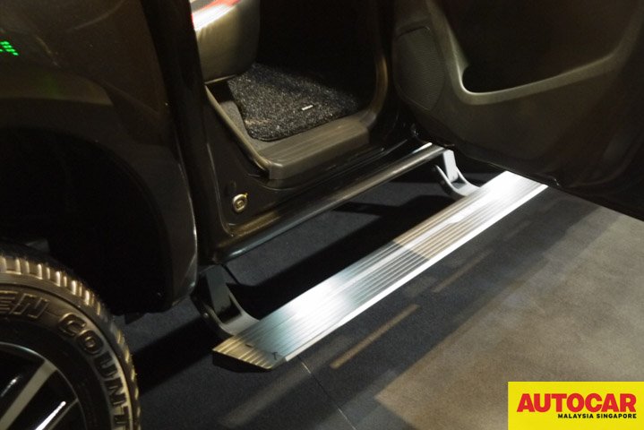 There are retractable side steps fitted on the truck. They deploy when any door is opened. They retract flat against the body when the door is closed. There is also an automatic welcome light on the steps for safety.