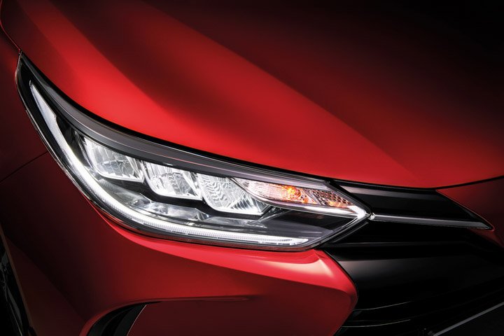 There is a redesigned front bumper with a front aerokit, front grille, triple bezel fully LED Headlights, and repositioned Daytime Running Lights (DRL) on more pronounced and carved front side intakes. The new triple bezel headlights have follow-me-home function. The revised Toyota Yaris will have a stronger resemblance to the Corolla and Camry.
