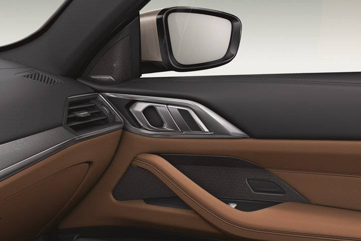 Standard interior equipment are sport seats for the driver and passenger, M leather steering wheel, M-specific pedals, Leather Vernasca upholstery, and BMW Individual headliner Anthracite, complete with interior trim finisher Aluminium Tetragon with highlight trim finisher in Pearl Chrome. M-specific stripes adorn the safety belts for both front and rear seats.