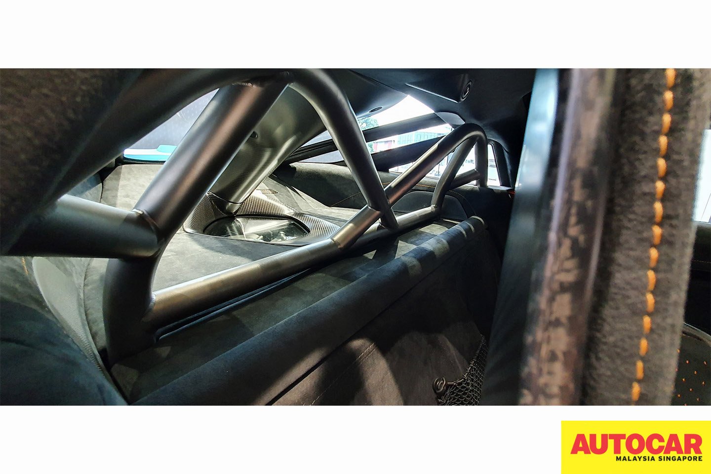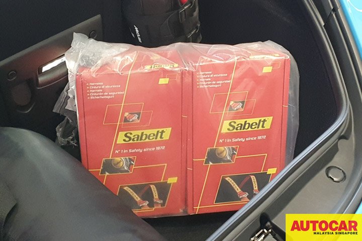 In the pictures, the car has Papaya Orange standard three-point seat belts which are for everyday use. The six-point harnesses were in the boxes in the boot.