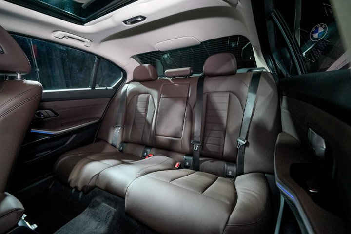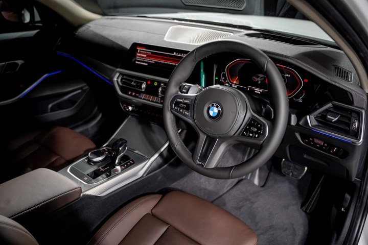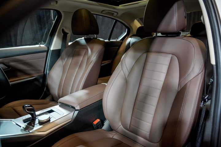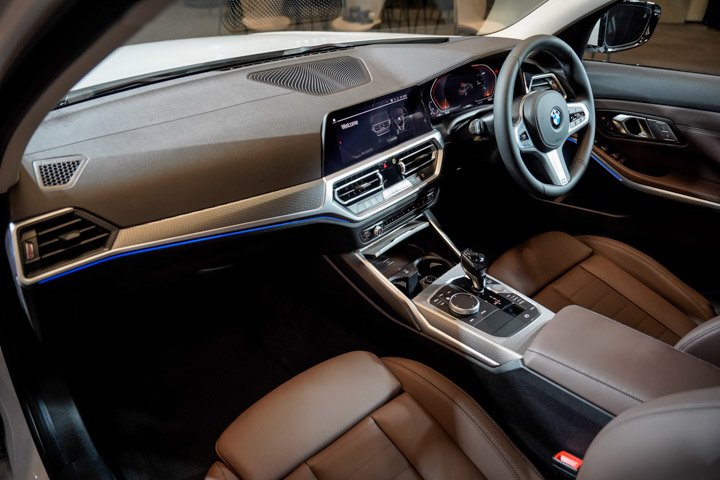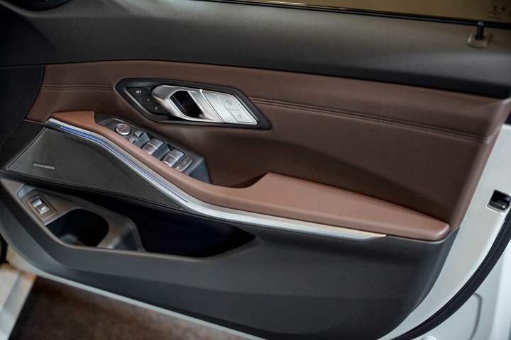 The BMW 330Li M Sport is available in Mineral White and Carbon Black. The upholstery is Leather Vernasca in Mocha with black contrast stitching.