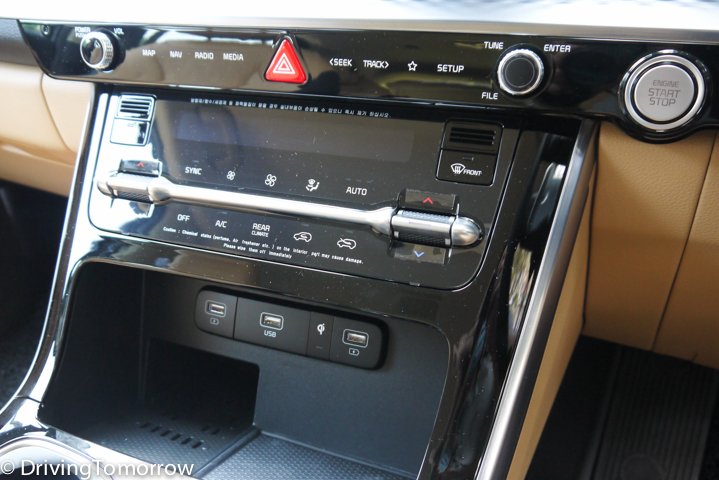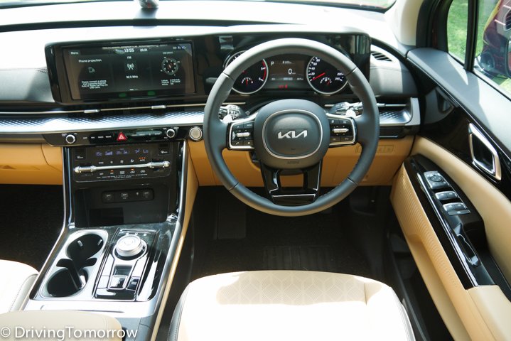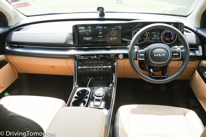 The tan and black seats, multi-way adjustable for the driver and front passenger were leatherette but not sweaty. There was dual-zone automatic air-conditioning in front and single-zone automatic for the rear. The Carnival also has a 360-degree surround view camera, and front and rear parking cameras, two 12-volt and seven USB ports and several cupholders.