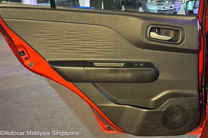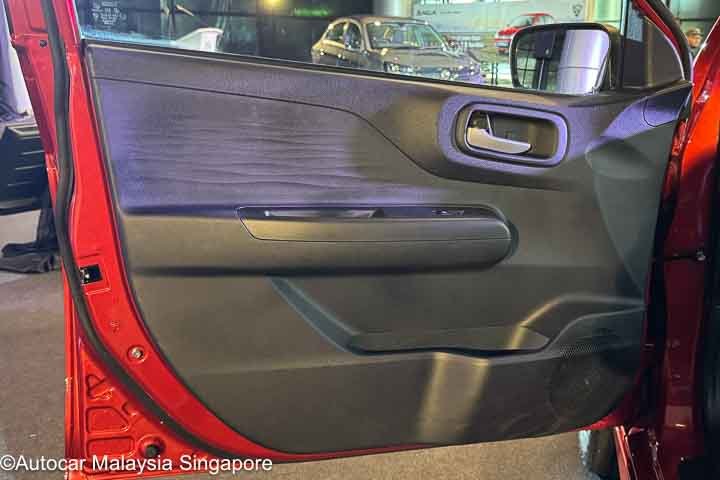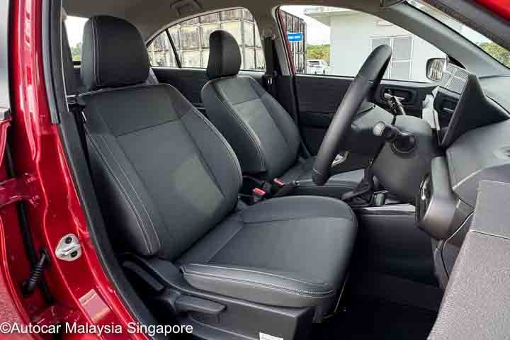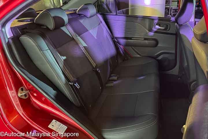 On the dashboard between the air vents for the front passenger, there is a tactile wave pattern. This wave pattern is also on the door cards. In the Executive variant, the pattern is also on the fabric upholstery. The Premium has two-tone leatherette seats, no pattern. The Saga seats are are bigger than the seats in rival Perodua Bezza. Wider by 1cm with 4cm more thigh support for the front seats. Meanwhile in the rear, the Saga has 6cm wider seats with 1cm more thigh support.