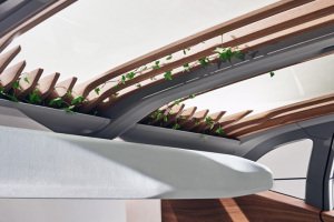 The interior materials are designed to be soft and tactile, while live plants are built into the dashboard and panoramic roof, to highlight the in-built air filtration system.