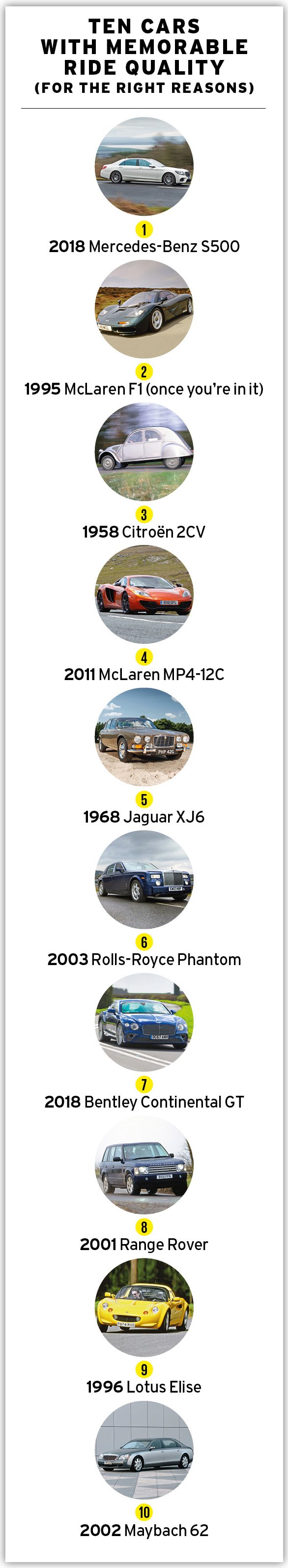 Bear in mind, too, that the softer the car is set up, the more sensitive it will be to load: I remember the original Lexus LS400 rode beautifully until you gave it four adults and a bootful of luggage and pointed it down an undulating road, whereupon levels of roll, heave and, in particular, pitch could soon become close to unacceptable. “And pitch,” says Cropley, “is the most upsetting body motion of all.” By contrast, I remember equally clearly a Bentley Continental T with a secondary ride so bad you’d not get a better impression of the road surface if you licked it with your tongue, yet it would dispatch our once notorious, now sadly resurfaced ‘body control road’ at ludicrous speeds with no detectable vertical motion at all.