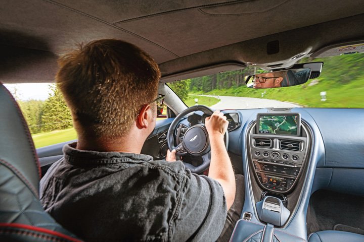 That’s what 663lb ft of twist from 1800rpm achieves: the kind of simple, near-instant low- and mid-range thrust that makes mid-sized-SUV-level kerb weight just melt into irrelevance, and steep Alpine passes seem as good as level for all the difference they make to your explosive forward momentum. I always suspected this was a landmark engine just waiting to reveal itself when sampled in the DB11; and heavens to Betsy, it’s good. It sounds melodic at times, and deliciously loutish and rough-edged at other times. Always authentic, though – even when it’s burbling and popping on the over-run through Aston’s bespoke exhaust tuning. And having gained that readiness to kick you firmly in the joy department from well below 3000rpm, it retains the uncanny ability to wind on the revs with an elastic vivacity above 5000rpm, too, pulling all the way to 7000rpm really freely. It’s a slight shame that transaxle gearbox doesn’t always match it for smoothness and slickness of manually cued shift speed, but its moments of clumsiness are few and far between – and I suspect it’ll get even rarer the longer that Aston has to work with this new ’box.