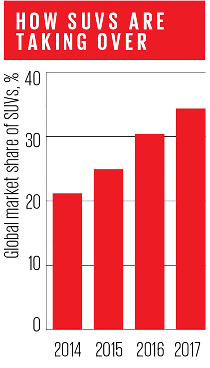 If you want to know why there are so many new SUVs coming on the market, consider that last year 34% of all cars registered globally were SUVs. That’s up from 22.4% in 2014, the year that the SUV boom really gathered momentum, according to JATO data.