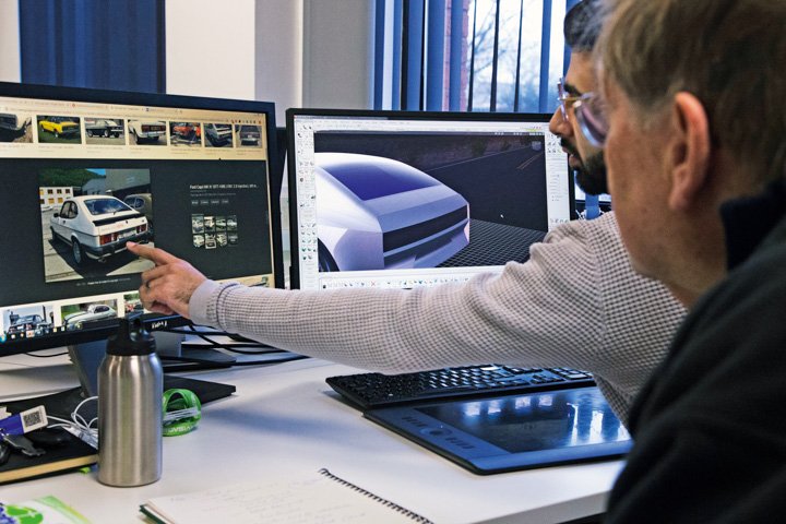 We argued over exterior details proposed on Mike’s and Aadil’s various sketches, alighting on lights from one, a bonnet and frontal treatment from another, wheel arches from a third, and adding a subtle but distinctive side-window sill detail – a descending line just behind the windscreen pillar – that I especially like from the original Capri. When you’re the client, you can make such selfish decisions.