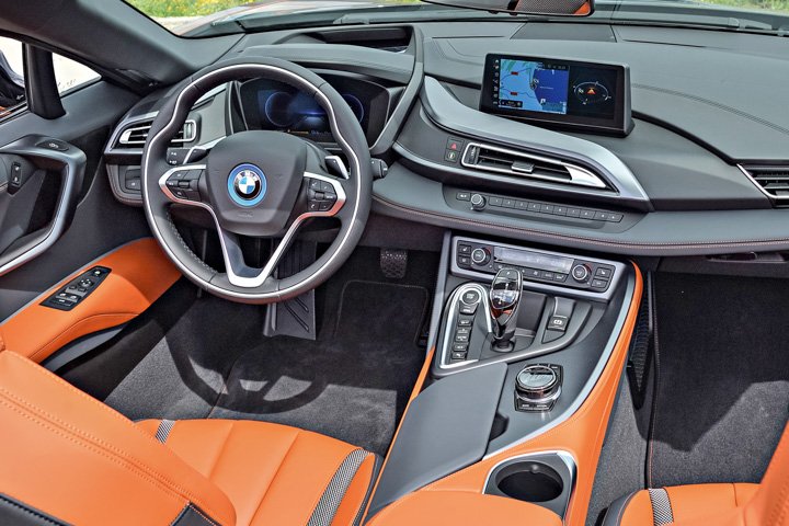 Inside, the dashboard design has been lightly updated for the i8 Roadster and facelifted i8 Coupé, with the latest iDrive system offering touch control on a free-standing 8.8in monitor and rotary control via a dial on the centre console. There are also new seats, an optional head-up display and a range of new trims.