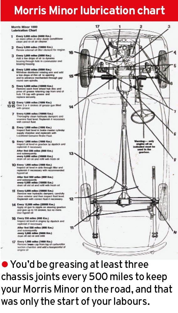 The operation manual of a Morris Minor from the early 1950s provides a clue to the scale and relentlessness of maintenance required. At 500 miles, six steering gear grease nipples required three or four strokes of a gun. At 1000 miles, the gearbox and back axle oil levels needed checking, along with the brake master cylinder, as did the SU carburettor’s dashpot. And the propeller shaft joints needed greasing. Every 3000 miles came an engine oil change, lubrication of the distributor and dynamo, light greasing of the contact breaker’s rocker arm pivot and checking the points in the electric fuel pump. In addition to all this, there was yet more at 6000 and 12,000 miles. So the incentive for drivers to do their own maintenance was considerable. There were plenty of magazines providing advice, and car maintenance evening classes were common.