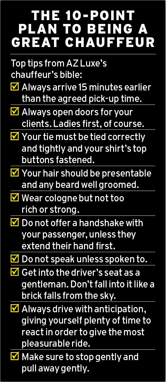 First, however, I must study the company bible, a guide covering everything from the required colour of his drivers’ ties (black or navy) to matters of etiquette such as not asking for a selfie with your passenger.