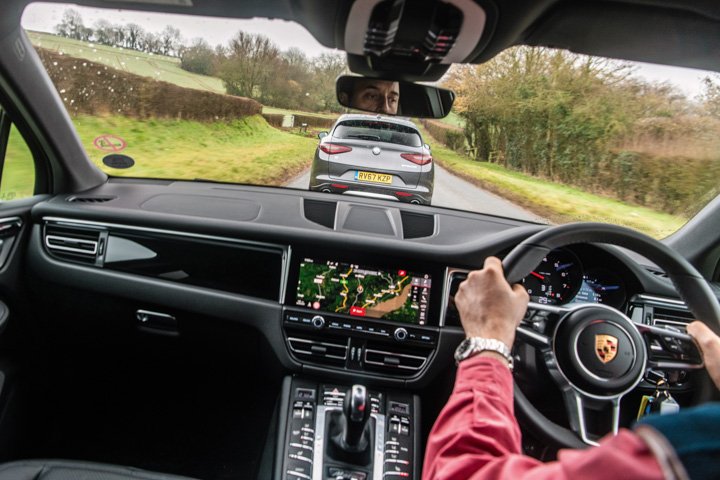 Second, despite having one less ratio, the Porsche gearbox is snappier than the Alfa’s and good at keeping the Macan’s motor percolating at the energetic speeds it needs to do its best work.