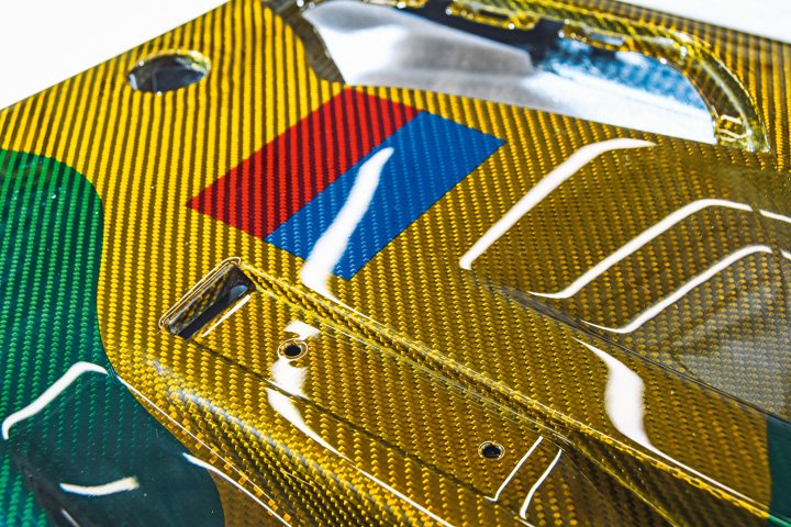 Finishes can be clear gloss or satin, and they also act as an ultraviolet filter to prevent the yellowing that normally afflicts carbonfibre over time. Satin is the most challenging because imperfections cannot be polished out, so the finish must be perfect straight from the spray gun. Both gloss and satin finishes can be colour-tinted, producing a subtle but far more vibrant result compared with the traditional method of tinting the resin itself.