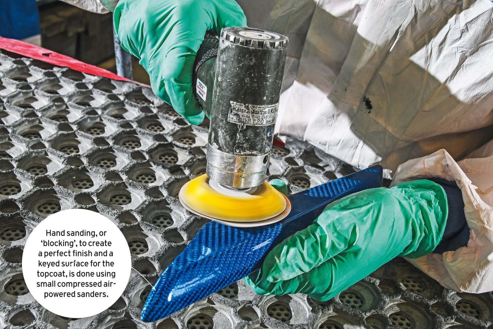 The second problem was getting the lacquer to adhere to the surface properly. Conventional metal surfaces are first sprayed with acid etch primer, which chemically grips the surface to provide a sound base for more primer and topcoats. That’s not possible with carbonfibre, so it has to be mechanically ‘keyed’ using abrasive paper. A relatively coarse grade is needed to produce a good enough key, but it’s easy to cut through the thin resin surface and damage the carbon fibres, in turn wrecking the component.