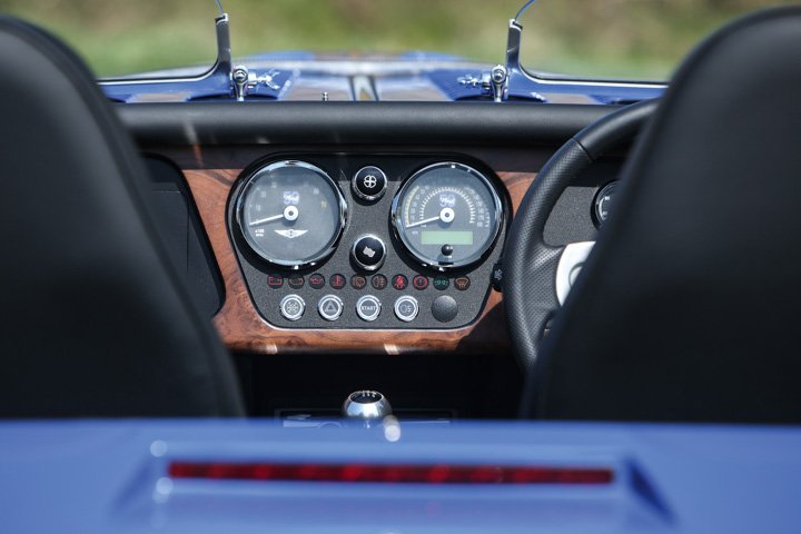 The car is mechanically standard but presented so as to evoke the memory of the original and most famous Plus 8, a well-raced car known as MMC 11 after its numberplate. So alongside the usual plaque, there’s a domed aluminium cover where you’d have once seen a spare wheel, a front towing eye painted yellow, wheels designed to mimic closely those of the original Plus 8, white tipped ‘cannon’ exhausts and white brake calipers. There is bespoke instrumentation and upholstery too. The car comes in two colours – green for those equipped with a conventional soft top and blue for the Speedster version seen here.