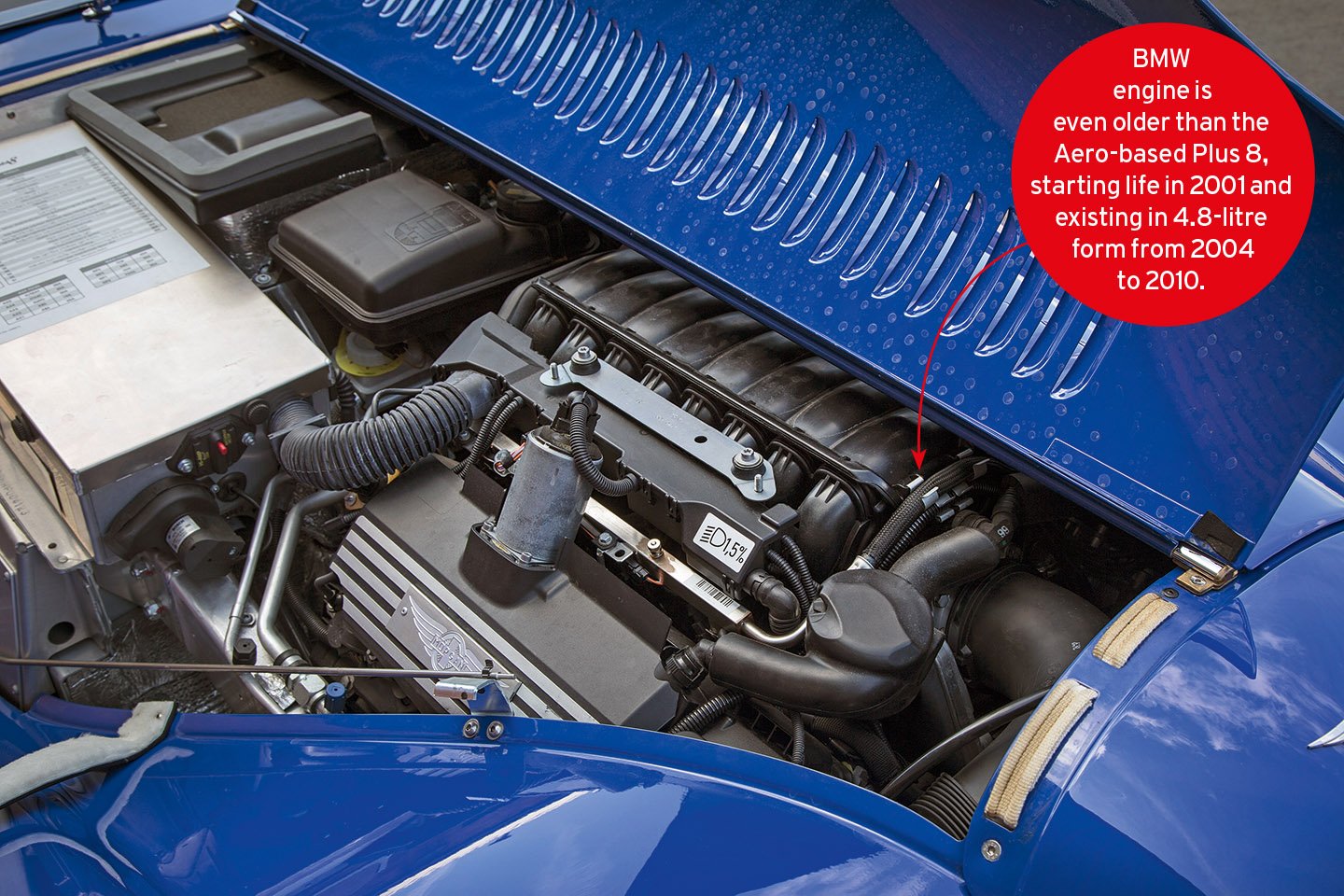 Yet there is something of the smoke and mirrors about this car, because the only thing about today’s Plus 8 that’s actually 50 years old is the name. The car itself died in 2004 when supplies of the Rover V8 that had powered it since 1968 ran out. What you’re looking at here is an Aero 8 attending a retro-themed Plus 8 fancy dress party that’s been going on since 2012. It has the Aero’s bonded, riveted aluminium chassis and, while its 4.8-litre motor is a V8, it’s supplied by BMW. So there’s no ash frame, nor even sliding pillar front suspension. It’s all far more modern than that. Then again, a new Porsche 911 is probably even less closely related to an original so maybe nobody cares.
