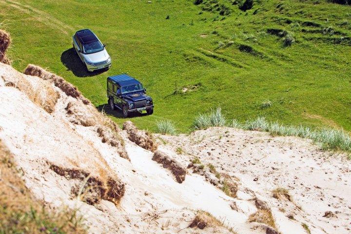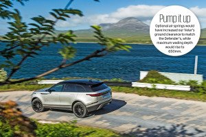 and we’ve felt no wheelspin at all. In fact, it’s the Defender, which is wearing road-biased rubber, that blinks first, momentarily breaking traction as it slithers up a steep, grassy hill. The Velar gallops neatly up with some throttle.