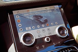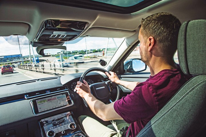 Our Velar is an HSE P300, meaning top specification and top performance thanks to a turbocharged 2.0-litre Ingenium petrol four-pot delivering 296bhp and 295lb ft. It saunters agreeably out of town, the eight-speed ZF auto keeping shifts gentle and revs low. Then it’s an easy mooch west along the M8, where the Velar delivers the imperious waftage requisite of the Range Rover badge. The engine is silent at 70mph and power sufficient; additional cylinders would be frivolous here. The cabin feels luxurious, too, but that’s as much down to its avant-garde design as the materials used, which are neatly applied but not quite as plush as you’ll find further up the range.