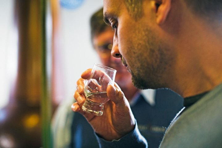 “Islay is very fertile, so you can grow barley, you can burn peat to dry it and there’s lots of water. The peat on Islay has a salty, iodiney character versus mainland peat, helping give Islay whisky its distinctive style,” Wills explains. From malting floor to peat kiln, mashing, fermenting and distilling through two copper stills, we follow the process from grain to clear alcoholic spirit, which is decanted into imported bourbon or sherry casks for maturation. After a minimum of three years, you have Scotch whisky.