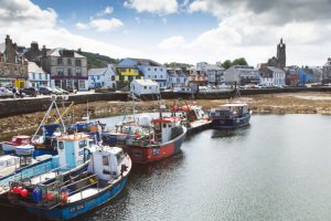We visit Port Ellen, with its little white crescent beach, and breathe in petroleous peat smoke from the village’s enormous maltings – our first encounter with Islay’s world-famous whisky industry. The road to our overnight stop at Bowmore then arrows past stacks of freshly cut peat among the bog cotton and reeds on one of those glowing, still evenings that let you forgive Scotland its wilder moments.