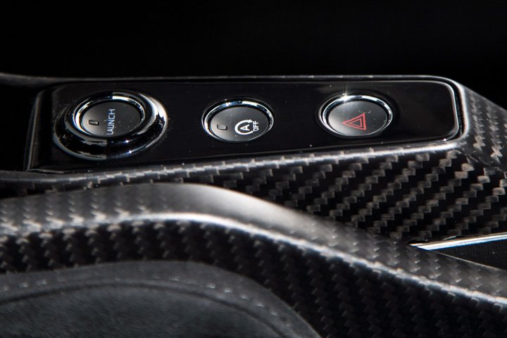 Also located in the roof is the button to engage full-bore Race mode, although the three standard driving modes – Comfort, Sport and Track – are engaged via a switch on the centre console.