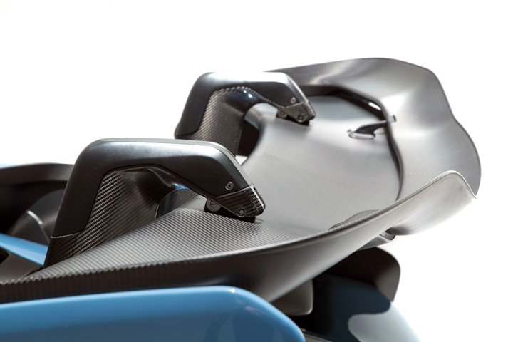 The imposing rear wing, attached to the car via ‘swan neck’ pylons, weighs 4.87kg and can support more than 100 times its own weight in downforce. The Senna generates its maximum downforce at 155mph, but above that speed – the car tops out at 211mph – the wings adjust to bleed off unneeded downforce.