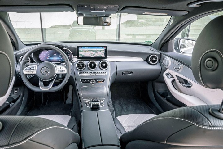 Facelifts: there are light ones, heavy ones and those that look light but are, in fact, really rather heavy. The fourth-generation C-Class has undergone one such facelift, with around 6500 parts – half of the car’s overall tally – replaced or modified in preparation for battle with BMW’s next-generation 3 Series and an updated Audi A4. There’s a new digital instrument binnacle, a 12.3in infotainment display as part of the £2795 Premium Package, the exterior design is more expressive (it’s pretty marginal) and you can option adaptive headlights made up of 84 rotating LEDs. All in, Mercedes’ junior saloon is as pretty as it ever was.