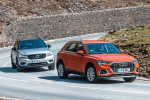 The XC40 is slightly lighter, keener and more agile than the Evoque in how it tackles sharper corners. Its ride is noisier, though, and its vertical body control is less progressive and sophisticated than the Evoque’s, making a fuss over choppy surfaces that the Land Rover’s suspension simply smothers. The Q3 is a touch crisper and keener-handling than the Evoque, too, and it has the assured outright grip levels and lateral body control you expect of an Audi. It has a less settled, less absorbent ride than the Land Rover, though, and it steers with a sense of filtered, distant aloofness and little reassuring weight or feel, so it’s harder to place and less satisfying and fluent as a result.