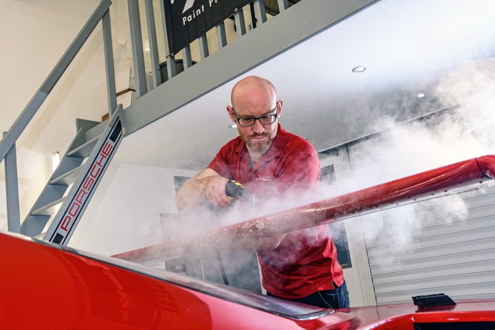 Probably the flattest, most photogenic surface to demonstrate how to apply the material is the spoiler. First, though, it needs a clean and Johnson’s Baby Shampoo is ideal, along with a good old-fashioned clay bar. Jules is using them to get the watermarks out of the paintwork. Next, the film is tacked on and then the steam, lots of steam, is used to stretch it. Jules is constantly sliding his hand back and forth. The heat transfer from his hand means he can’t afford to stay in one position. Teasing the film into the curves is highly skilled. Lesser wrappers may not go to the bother of a template and, horror of horrors, may even cut the film on the car. Jules visibly winces at the thought.