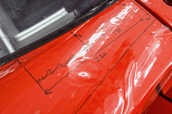 “With a template, there is a software package and using a plotter and CNC system, which cuts the film into panel-sized parts,” Jules tells me. The trouble seems to be that the template for the F40 has been taken from side only and then simply reversed for the other. Luckily, Jules is a perfectionist, so he has been making a template of his own. He is well versed in this because many of the older cars they work on are not templated.