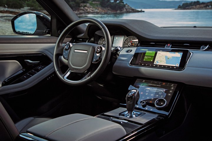 Land Rover’s Clearsight rear-view mirror comes as standard on the top-of-the-line Evoque or as an option elsewhere. A backwards-facing camera on the roof allows it the neat trick of switching to become a widescreen video display when you flick what would otherwise be the anti-dazzle knob on the bottom. The display is bright and clear and permits a much wider field of view than you’d otherwise have. It does have a habit of making objects look a touch closer than they are, mind you – and it isn’t much use in low direct sunlight.