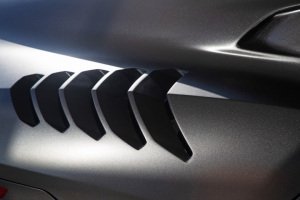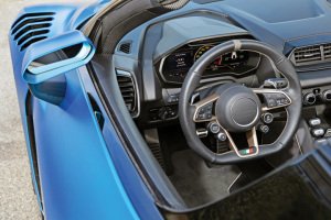 The ‘sexy’ element from his statement stems from a roof 50mm lower than an R8’s, “with a sensuous upper section. The lower part is driven by aerodynamics.” As can be seen in the massive double-decker venturi system at the rear, the sill extensions and the bold ventilation slats in the wing tops, which exhaust air from the brakes. These elements constitute what Perini alludes to as ‘mean’, as does the part-exposure of the massive 305/30 ZR20 Pirellis at the rear.