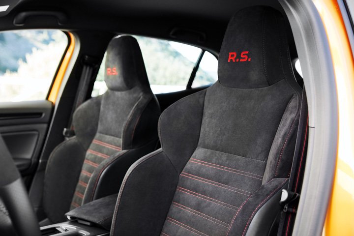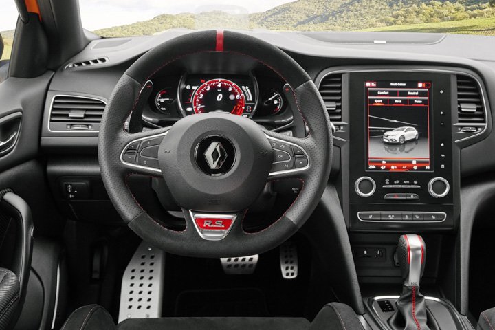For suspension, the Mégane RS sticks with struts up front and a torsion beam at the rear, but its front configuration has new geometry and retains Renault Sport’s PerfoHub technology, which reduces kingpin angle offset and therefore better resists torque steer and bump steer. The RS rides 5mm lower than a Mégane GT and has axle tracks widened by 45mm up front and 30mm at the rear.