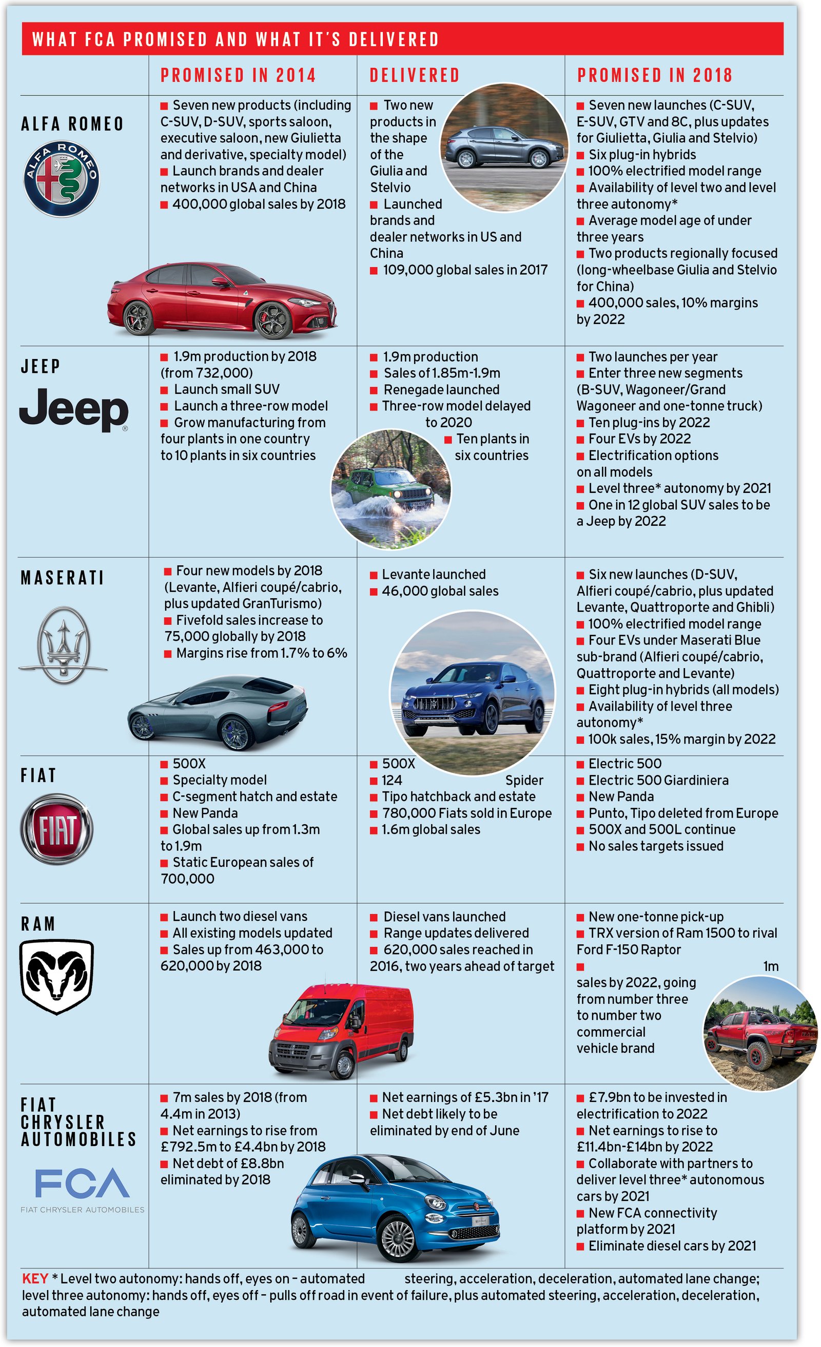A range of electric Maseratis, an Alfa Romeo supercar, massive expansion for Jeep and a substantial, £8 billion push towards electrification and autonomous models are Fiat Chrysler Automobiles’ major ambitions for the next five years.