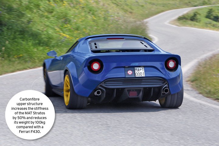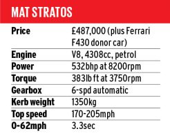 All of which brings us to the awkward issue of sacrifice. You’ve probably guessed it by now: in order to have a Stratos built, you must provide MAT with a Ferrari F430 to gut. It’s not a total sacrifice, of course, because much of the Ferrari’s aluminium chassis, the complete powertrain and the suspension form the basis of the new car. To the shortened chassis is attached a carbonfibre upper structure.