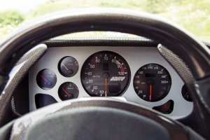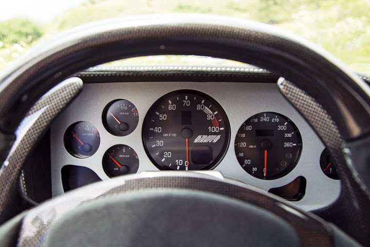 You must also live with instruments often blotted by not only the steering wheel but also a huge pair of carbonfibre paddleshifts and your hands. The aluminium-fronted binnacle references the original car’s, complete with the slightly haphazard dial location common in the 1970s.