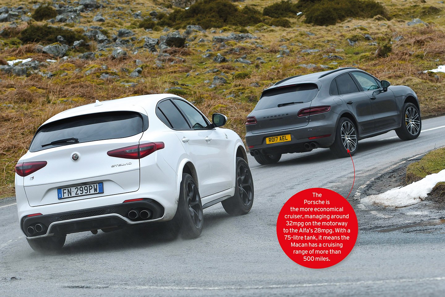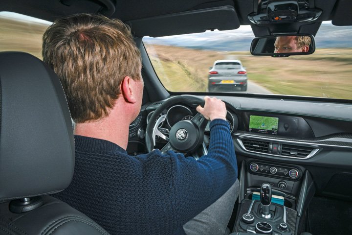 The sheer pace of the Quadrifoglio takes some getting used to, too. The official 0-62mph claim is 3.8sec to the Porsche’s 4.4sec. It’s an absurd figure, and although the Alfa is the marginally more closely geared of the two and nearly 200kg lighter, its capacity for leaving something as quick as the Macan almost for dead on these roads is nevertheless staggering. You’ll need to engage Race mode to get the best out of this 503bhp twin-turbo V6. It sharpens the throttle response and ups the vocal ante to glorious levels. It also disables the stability control, but so benign and malleable is this chassis that you always feel in total control.