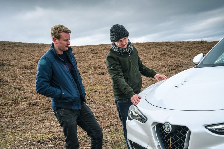 All of which is thrust firmly to the back of my mind when I arrive in the Porsche at our meeting point above Crickhowell. Picture editor Ben Summerell-Youde is waiting with the Alfa, which, painted in a faintly pearlescent shade of white, blends in around these parts like a Burger King outlet on the set of La Dolce Vita. Judging by the heat haze over the triple-slatted bonnet vents, somebody enjoyed the journey over too. It has vast presence, this Stelvio Quadrifoglio, simultaneously appearing curvaceous and hard-edged. The jutting wheel-arch extensions could be considered crude on something costing half the asking price, and you’ll find a less gaping expanse of fresh air above the tyre tread of Séb Ogier’s Ford Fiesta WRC car.