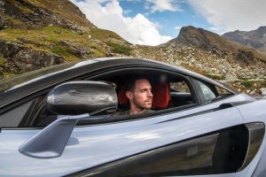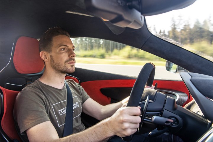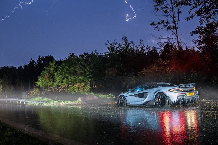 Leaves blow in spirals across the road and spots of rain appear on the windscreen. With night now upon us and the rain falling hard, great flashes of white illuminate everything around us. As we continue into the storm, those flashes of white soon become individual bolts of lightning that split the sky in two. The rain is so heavy now that the McLaren’s wipers cannot keep up. We drive through a small town and on to an autobahn, the rain coming down harder still. Visibility is reduced to near enough nothing at all, the windscreen and the road both flooded with rain water. We crawl at 40mph or so, but I can’t risk going too slowly in case somebody arrives at some greater speed from behind us. Every time the road ahead disappears behind a screen of water or is lost in disorienting reflections, I simply wait for the crunch of carbonfibre against Armco.