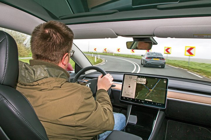 The Model 3 rolls only a little more but makes you feel every degree in your more lofty driving position and it also has more to do to rein in its body movements. It rides comfortably but ultimately the BMW is the more satisfying driver’s car by a decisive margin, although you probably do need to get out of town to appreciate it.
